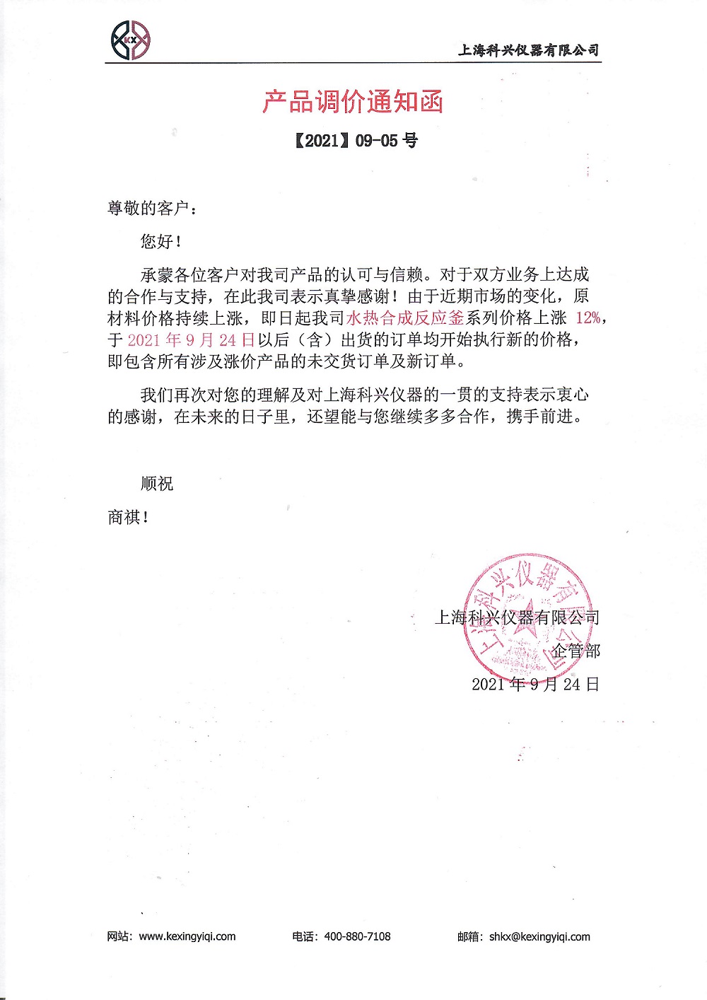 承蒙各位客戶對我司產品的認可與信賴。對于雙方業務上達成的合作與支持,在此我司表示真摯感謝!由于近期市場的變化,原材料價格持續上漲,即日起我司水熱合成反應釜系列價格上漲 12%,于 2021 年 9 月 24 日以后(含)出貨的訂單均開始執行新的價格,既包含所有涉及漲價產品的未交貨訂單及新訂單。